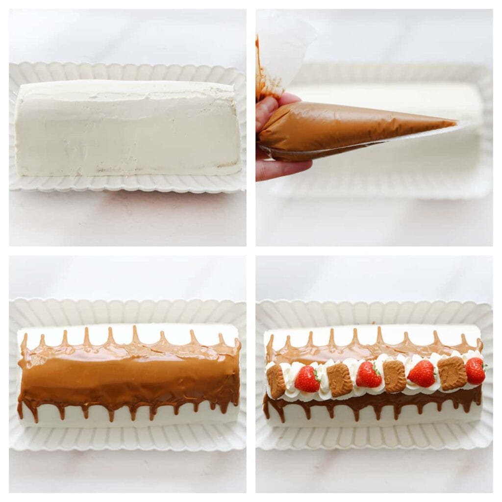 8 Spuit de speculoospasta boven het dessert door langs de zijkanten te gaan. Maak een 'drip' en vul het binnenste gedeelte met speculoospasta. Laat de speculoospasta iets stevig worden voordat je er room op spuit. Garneer met een langwerpig toefje room, stukjes aardbei en halve speculooskoekjes. Bismillah, geniet ervan! |