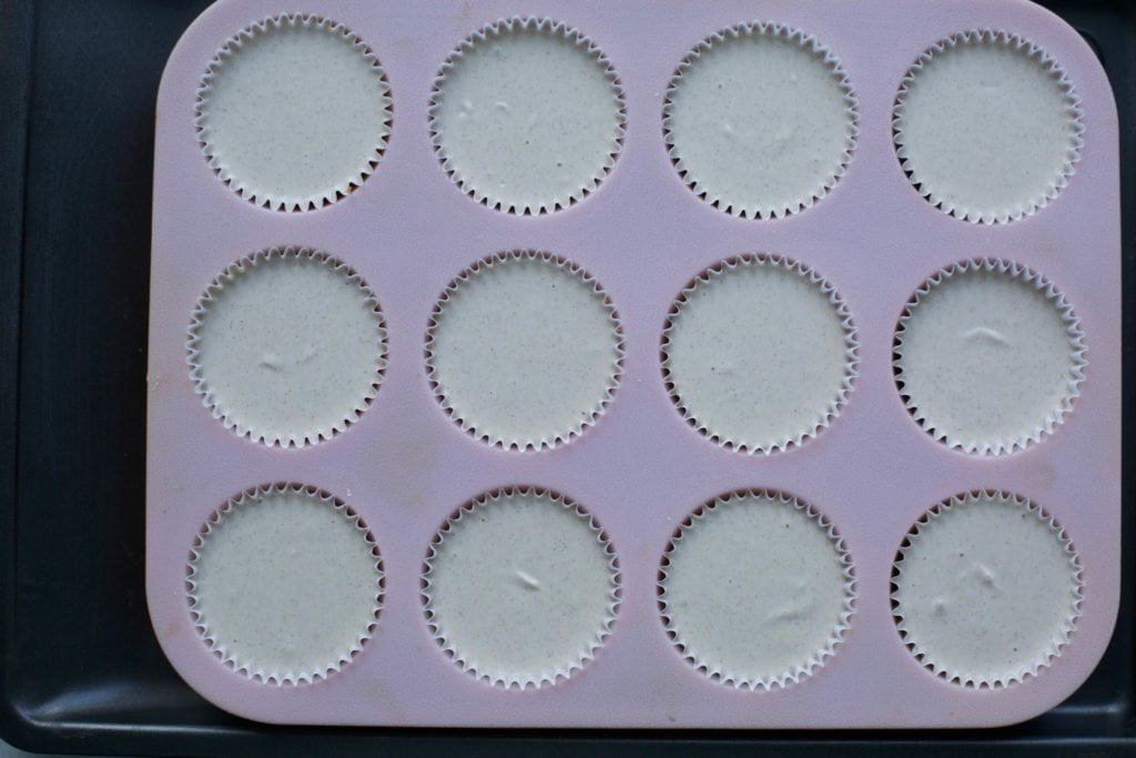 4 Plaats de cupcake papiertjes in de muffin bakvorm. Vul het voor een deel met het koekjesdeeg (ongeveer 15 gram). Neem een cupcake papiertje en leg het op het koekjesdeeg, druk het plat met een glas. Op deze manier druk je alles stevig aan en voorkom je dat het koekjesdeeg plakt. Herhaal de werkwijze. |