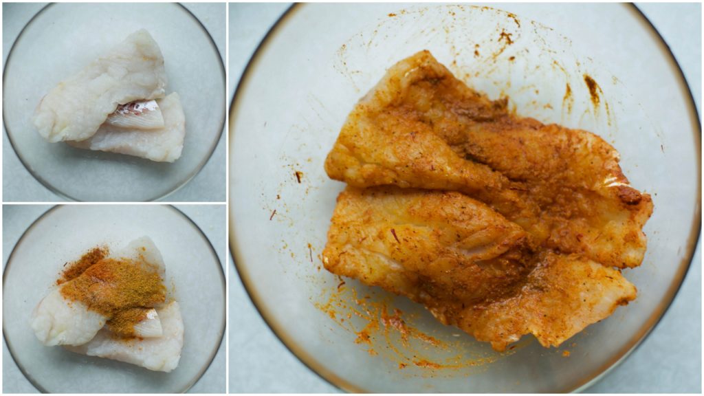 2 Doe het zout, ras el hanout, paprikapoeder, zwarte peper en komijnpoeder in een diepe kom. Meng ze samen tot een kruidenmix. Verdeel de kruidenmix door twee. |