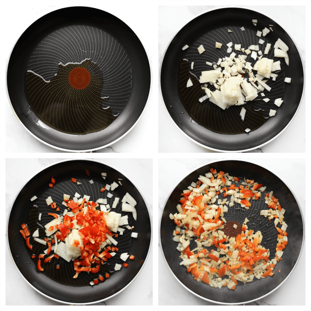 Voorbereiding: Snipper de ui en snijd de rode paprika een dag van tevoren. Bewaar ze afgedekt in de koelkast.