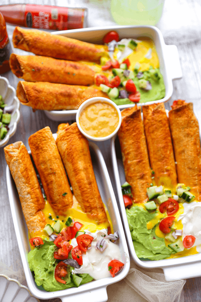 Geniet van deze eenvoudig te maken gevulde Kip Taquitos! Het is echt zo makkelijk te maken en ontzettend lekker van smaak! De tortilla’s worden tot in perfectie gebakken en geserveerd met een variatie aan sausjes, waardoor dit een heerlijke gerecht is voor elk moment.