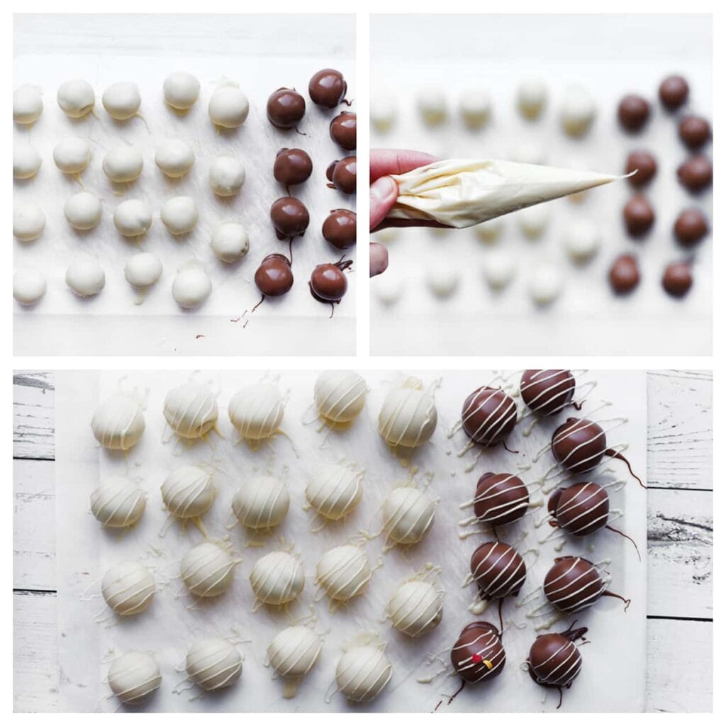 Gebruik een spuitzak voor het aanbrengen van chocoladestreepjes op de truffels.