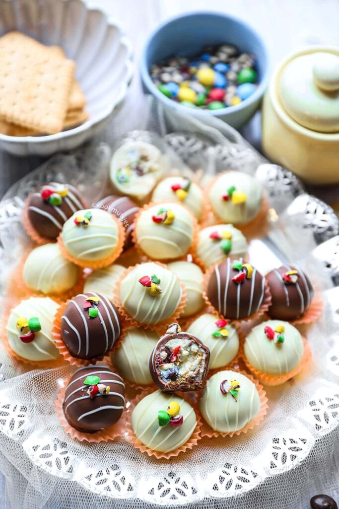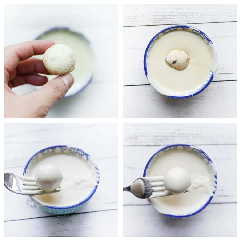 Laat de truffels voldoende tijd in de vriezer staan, zodat ze goed stevig worden. Dit vergemakkelijkt het dompelen in gesmolten chocolade en zorgt voor een mooie, gelijkmatige coating.
