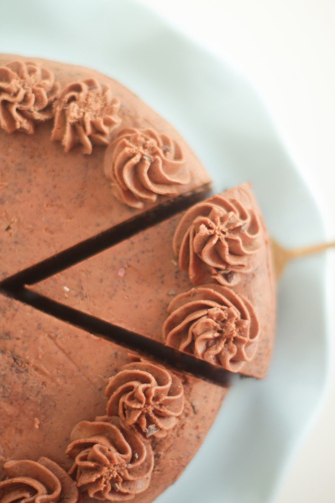 Mijn bakvorm komt van de Xenos en is 22 bij cm. Ik heb een een chocolade frosting gemaakt voor deze cake en past er goed bij! Je zou nog wat aardbeien, framboosjes kunnen toevoegen om de cake wat frisser te maken.