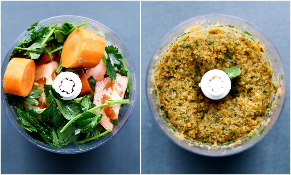 1 Ontvel de ui, tomaat en schil de wortels. Hak de koriander en peterselie. |