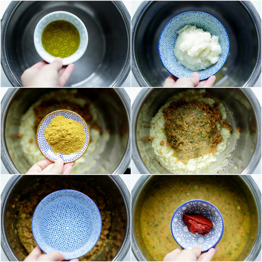 4 Verhit de olijfolie in een pan. Voeg de ui toe en bak het voor een paar minuten. Voeg de groentes en ras el hanout toe, bak het mee voor een paar minuten. Voeg het water en tomatenpuree toe, kook het op hoog vuur. Wanneer het goed borrelt, zet je het vuur wat lager. Kook het verder voor 20 minuten. |