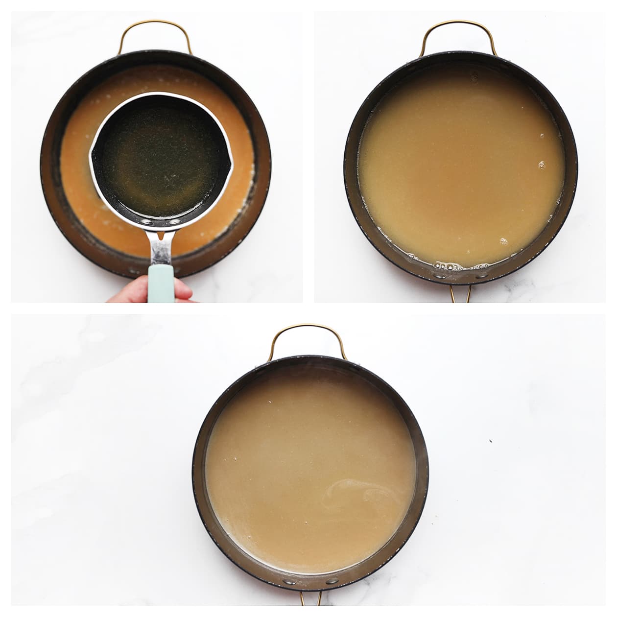Zeef de bouillon zorgvuldig zodat je een gladde saus krijgt zonder stukjes groente of kruiden.