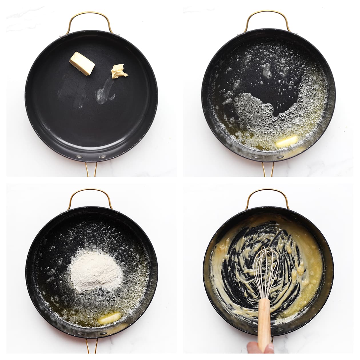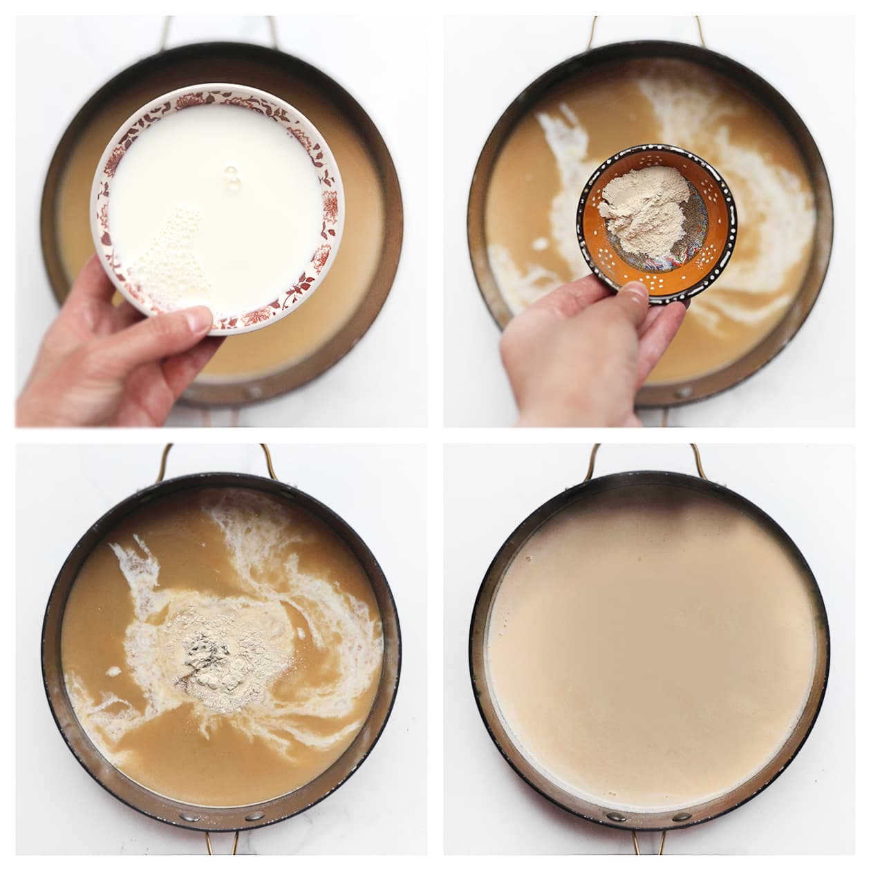 Voeg de bouillon beetje bij beetje toe aan de roux en blijf goed roeren om klontjes in de saus te voorkomen.