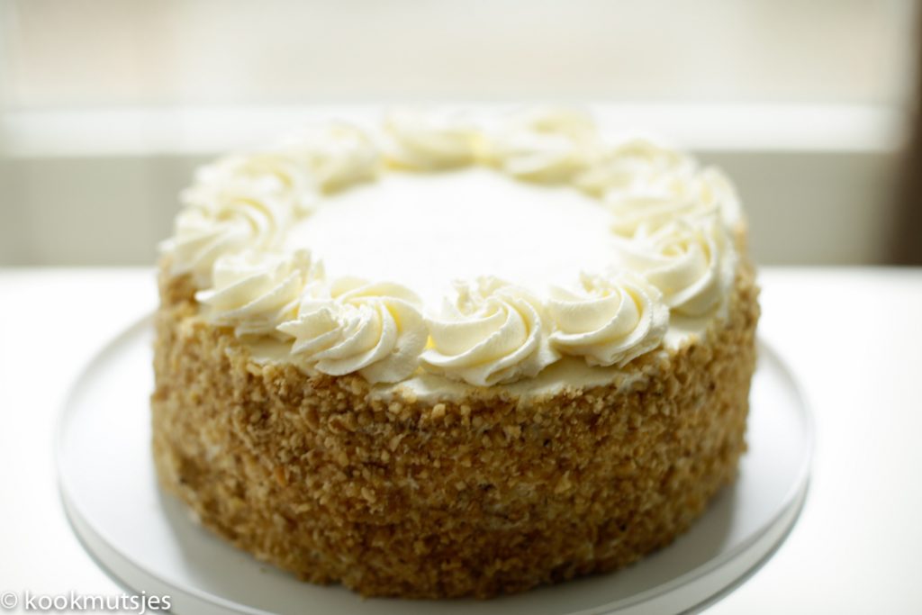 Deze drie-laags wortelcake maakt het nog smaakvoller dan normaal en de textuur is lekker zacht, luchtig, smeuïg en de taart smaakt totaal niet machtig. De subtiele smaak wordt overmeesterd door de basterdsuiker en wordt omhelst door de warme kaneel. Het barst vol met (rauwe) geraspte wortel, gemalen walnoot en heeft een zachte toevoeging van slagroom en mascarpone (de room is erg soepel, zijdezacht en goed smeerbaar). Decoreer de walnoten ook rondom de taart, waardoor elke hap niet alleen barst van de smaak maar ook van textuur. Bovendien zijn ze ook de perfecte decor! Als je de walnoten extra knapperig wilt hebben, raad ik je aan om ze vooraf te roosteren. Al met al, dit is een zachte taart met knapperige walnoten en een romige vulling, klinkt best goed toch?