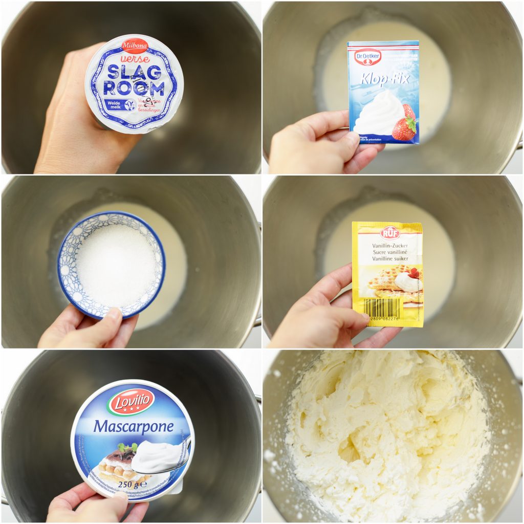 Wanneer zou ik de mascarpone moeten toevoegen? Samen met de slagroom of nadat deze is opgeklopt?