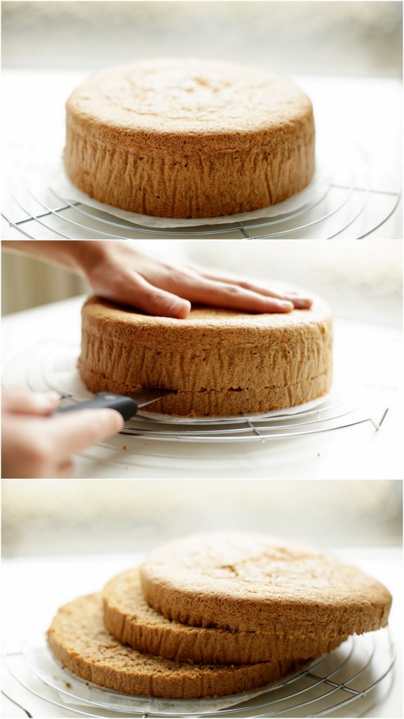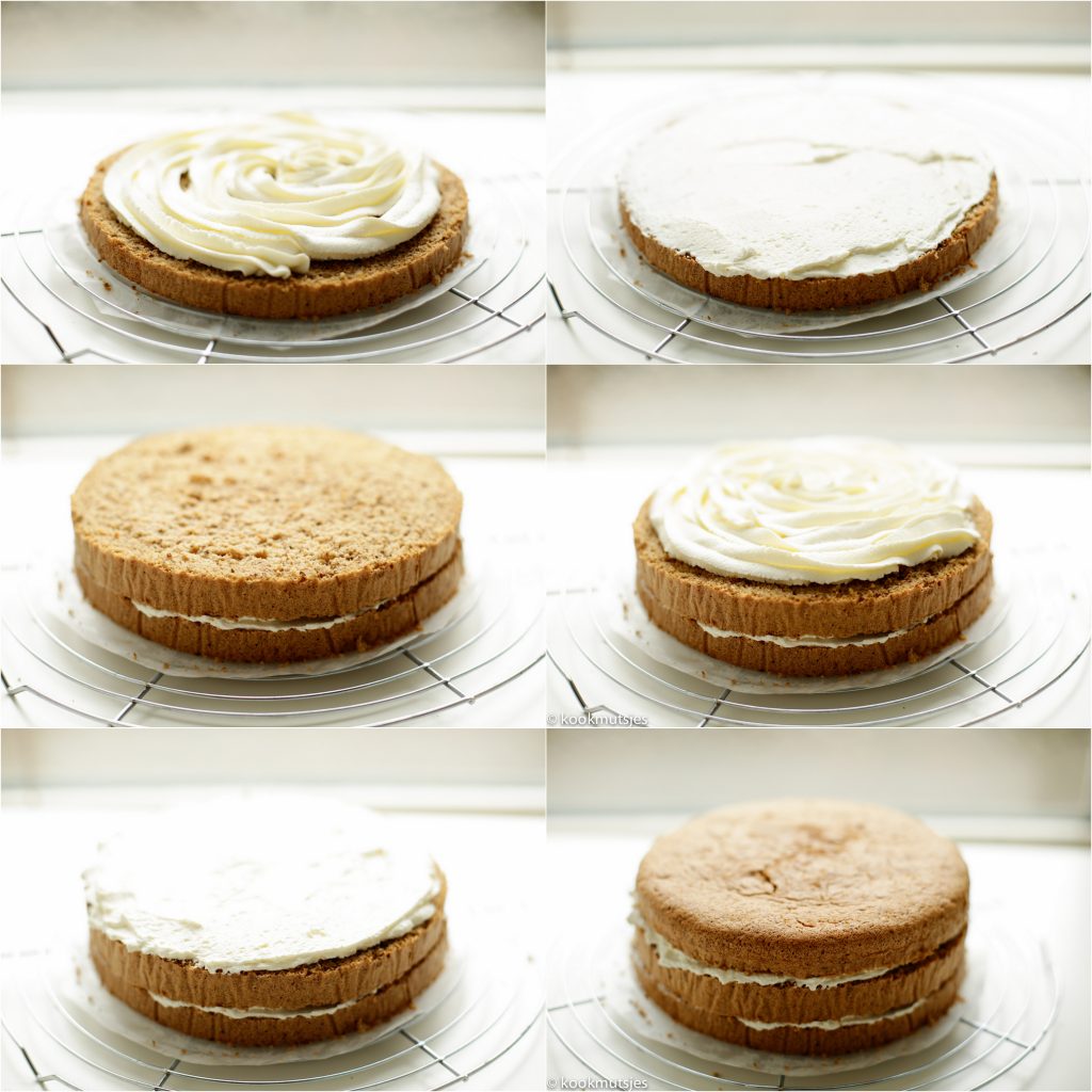 Je zou de biscuit in twee kunnen verdelen, maar zelf raad ik je aan om er een grote cake van te maken. Biscuit is luchtiger en voor het snijden gebruik ik een grote broodmes, werkt erg goed! xx