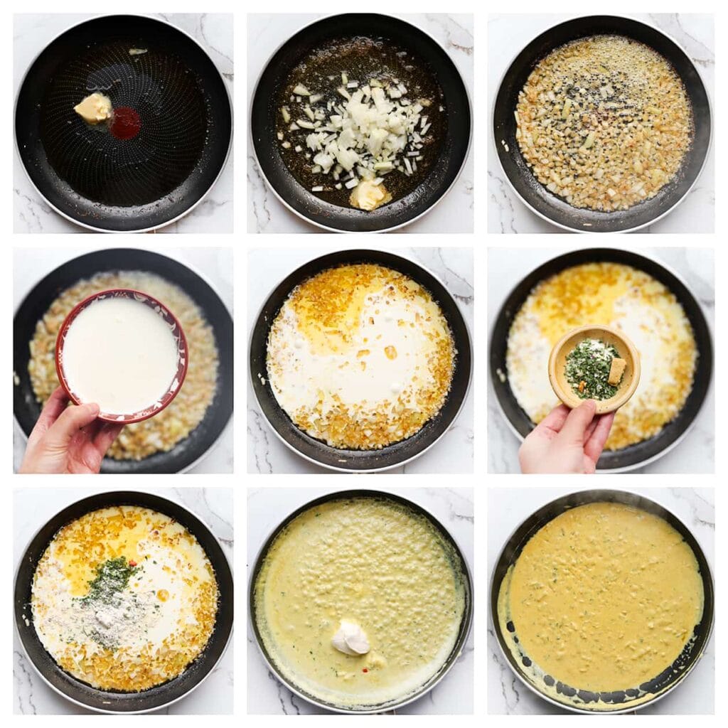 3 Verhit de roomboter in een koekenpan op middelhoog vuur. Voeg de gesnipperde gele ui toe en bak deze 4-5 minuten, of tot de gele ui goudbruin is. Voeg de ongeklopte slagroom, uienpoeder, currypoeder en gedroogde peterselie toe. Verkruimel het visbouillonblokje boven de koekenpan, meng goed en laat het 5-7 minuten koken, of totdat de saus goed is ingedikt. Voeg de crème fraîche toe en kook nog 2 minuten mee. |
