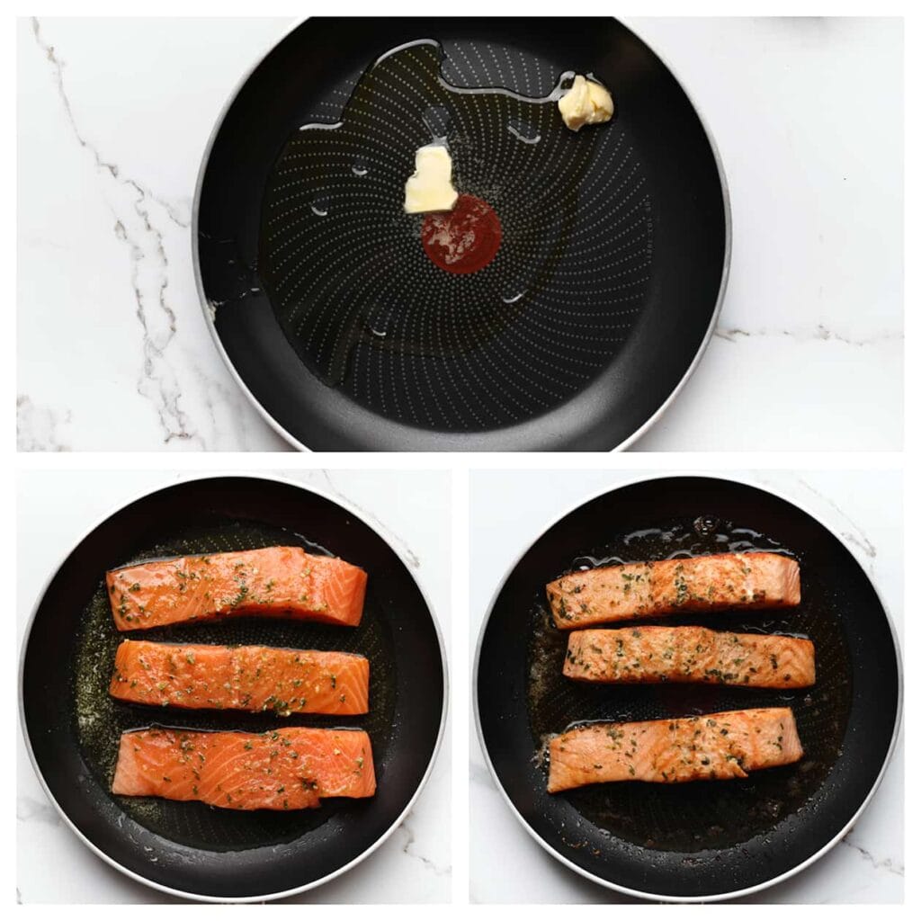 Zorg ervoor dat de koekenpan goed heet is voordat je de zalm toevoegt, en bak de zalm snel aan elke kant. Dit helpt om de zalm sappig van binnen te houden terwijl de buitenkant een mooie korst krijgt.