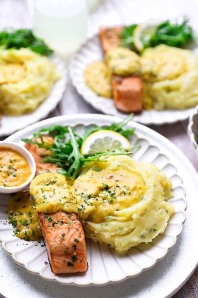Presenteer het gerecht mooi op het bord. Leg de zalmfilet naast een portie aardappelpuree en schep wat van de saus eroverheen voor een aantrekkelijke presentatie.